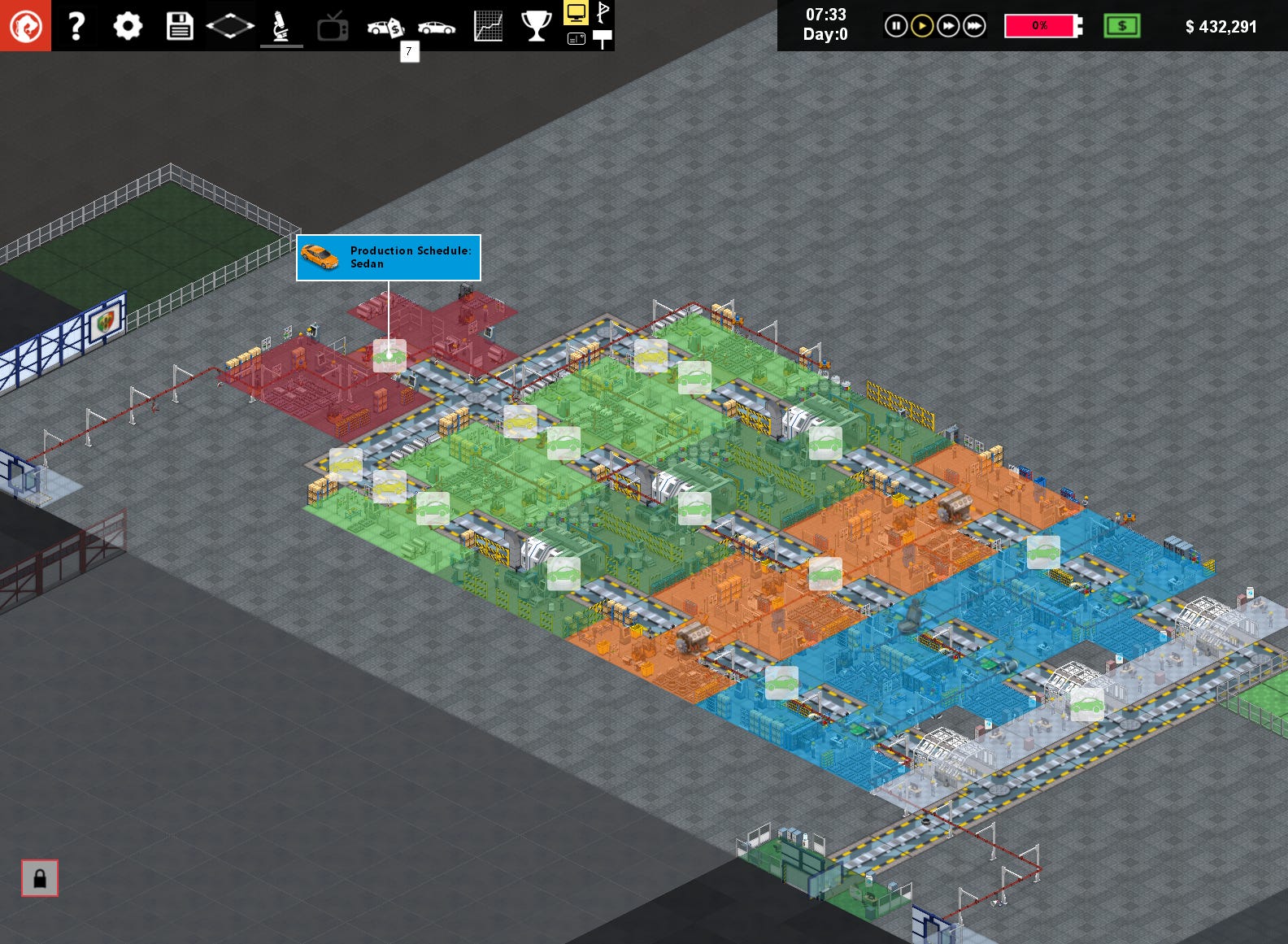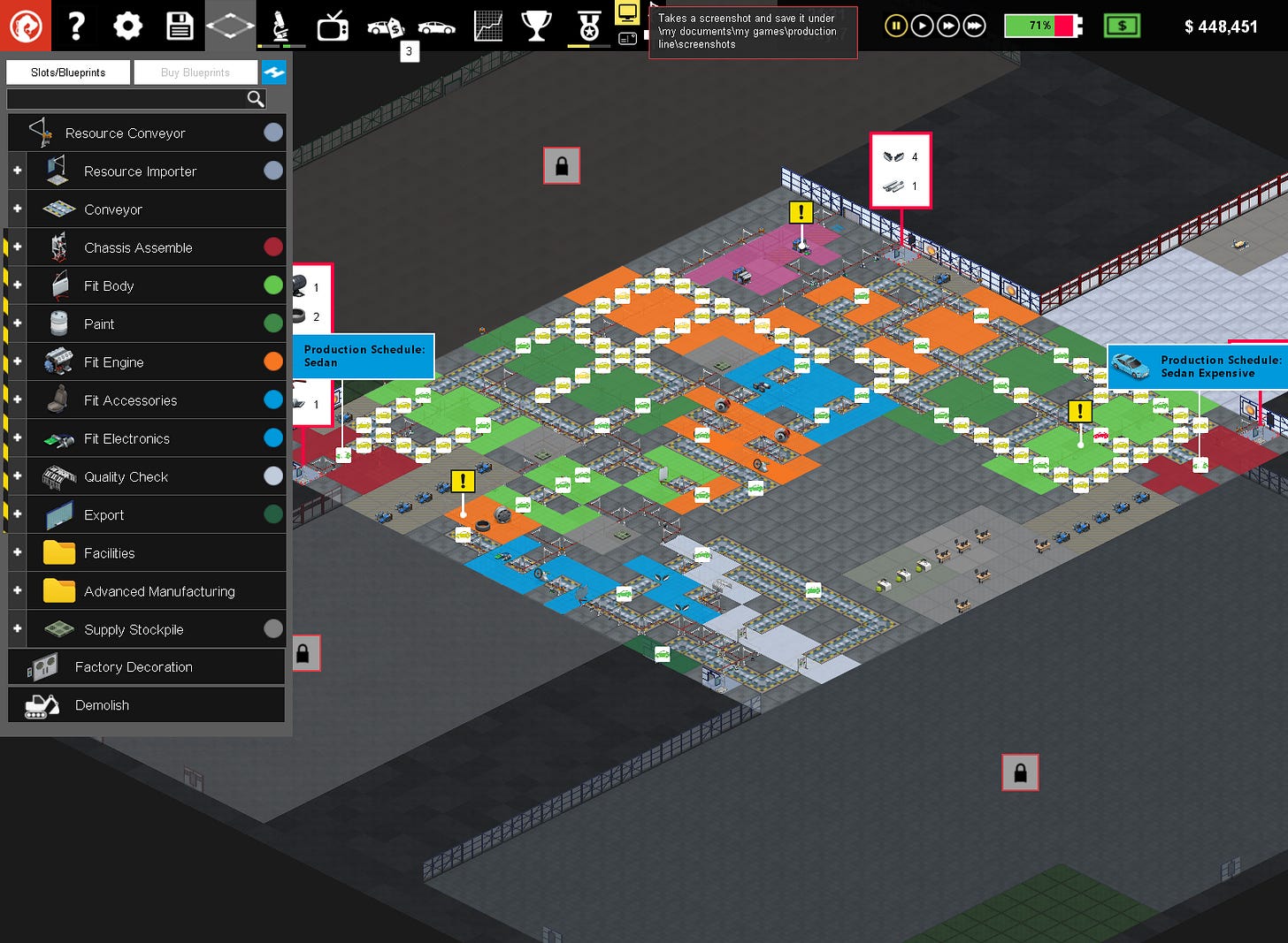 Starting out, I skipped all instructions on how to play and started a new company, Baboo Industries. I bought a small factory and had $1.3M leftover to buy factory equipment. As I laid out my first line, I placed the starting station, chassis assembly, into the front of the factory near the receiving docks and ended with a quality inspection precisely aligned with the export door. The sedans I would be producing would have their chassis assembles every 13 minutes then traverse one of three sub lines consisting of body panel assembly, paint, powertrain fit, accessories fit, and electronics fit stations before being inspected for defects and exported to the dealership showroom. The planned bottleneck was initially the paint shop, clocking in with a cycle time of 34 minutes and 24 seconds, but as the game progressed that changed rapidly and I was wishing I had read the instructions.