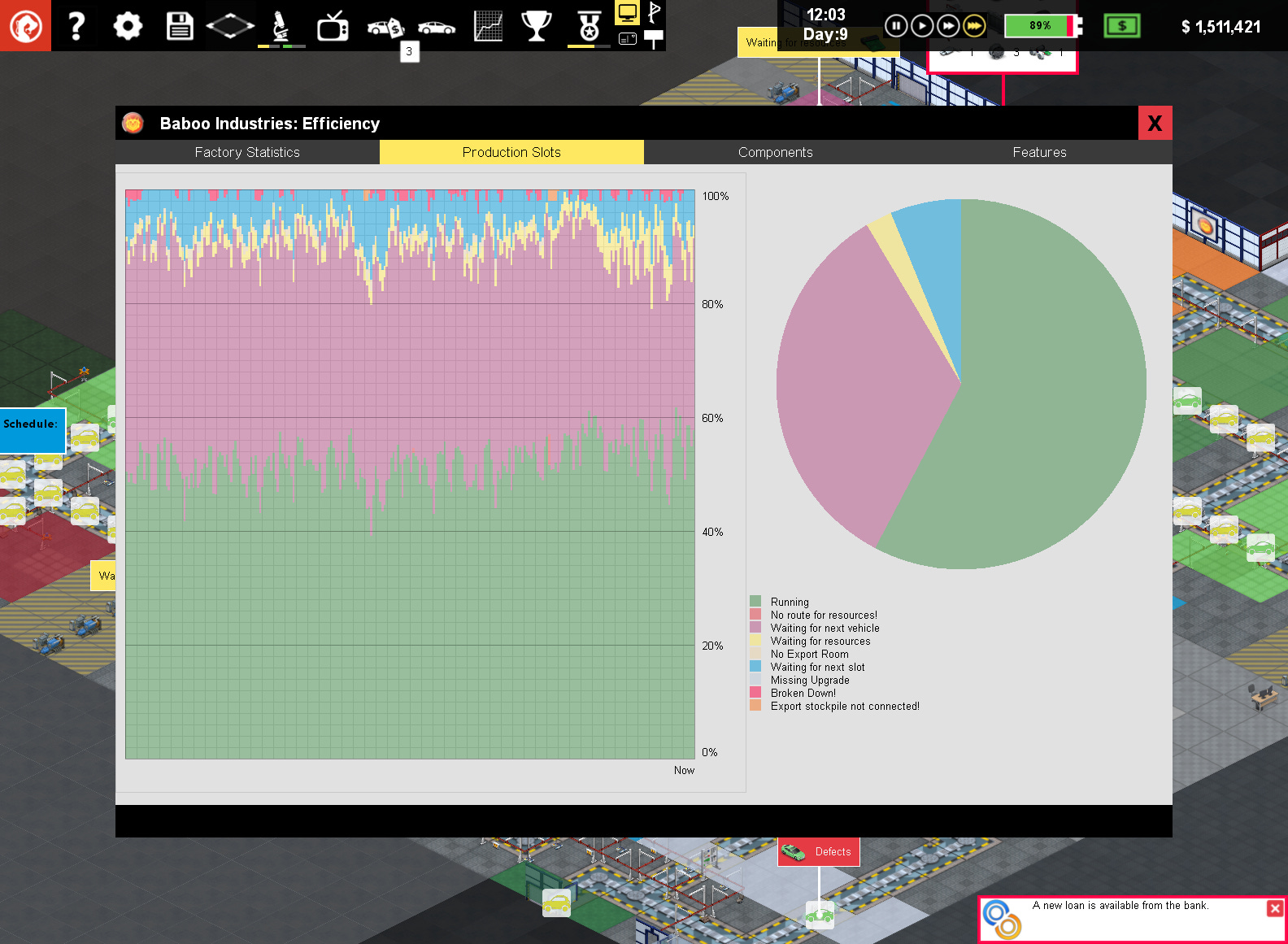 As the days progressed, the sedan was selling well so I needed to commission a new line. I took out a loan at a high interest rate and started laying out my second line which began in the complete opposite corner of the factory. The goal was to balance the overall throughput of the factory by having separate lines for the long running operations of body panel assembly, paint, and powertrain fit then merge the lines for quick operations such as accessories and electronics fit. Along the way I had researched new features for the sedan such as a start-stop engine, cruise control, and electronic windows alongside factory efficiency technologies such as faster robots and conveyors. These changes to both the car being produced and each station efficiency dramatically changed where the bottlenecks occurred within the lines. It was a constant struggle to add and remove stations while keeping the line moving and investing in new features that customers wanted.