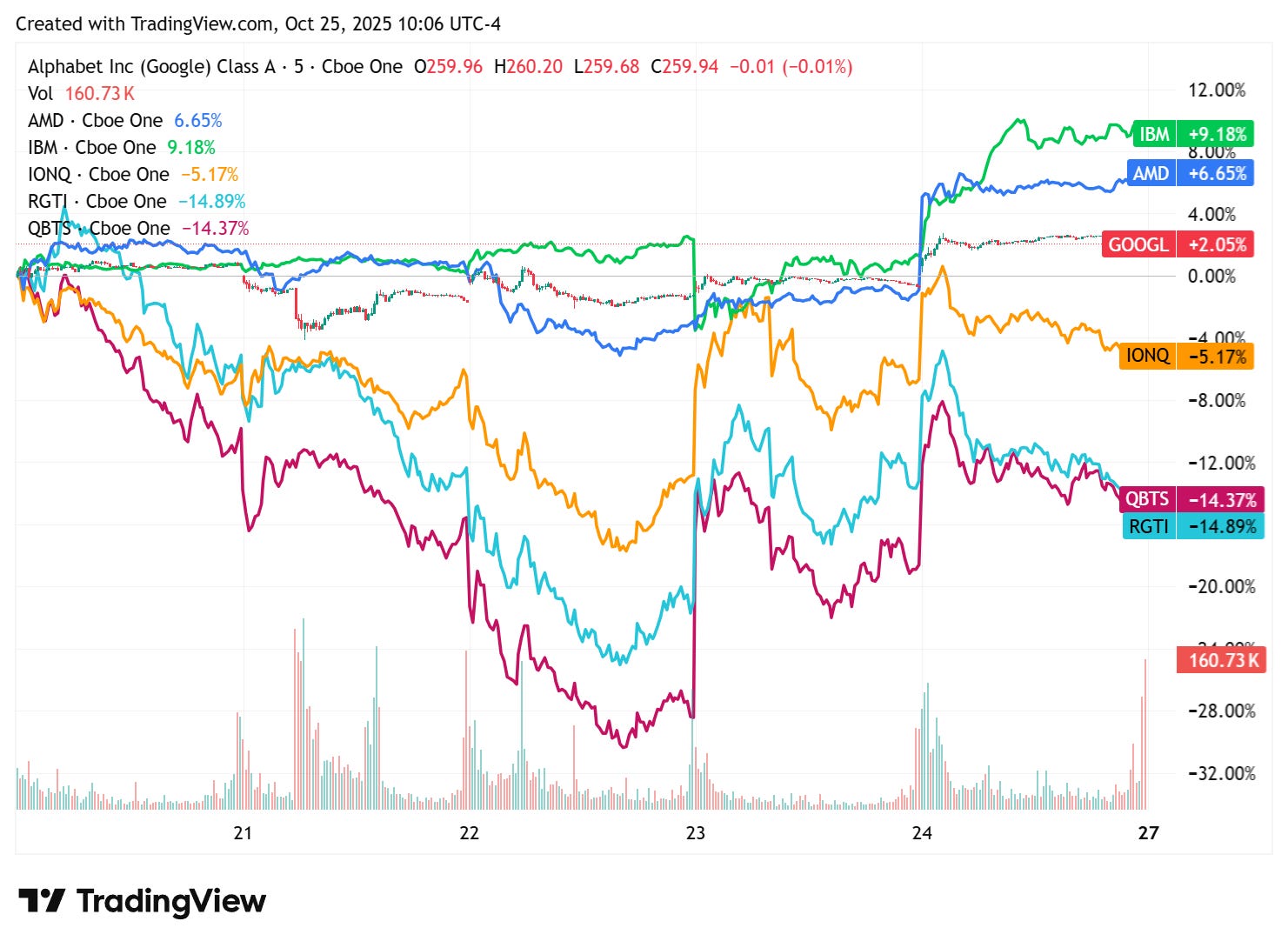 Google Quantum Echoes algorithm /Google/ Breakthrough on Willow Chip /Bloomberg/ while AMD’s stock pops nearly 8% on report IBM can use its chips for quantum computing error correction /CNBC/ and the Trump Administration in Talks to Take Equity Stakes in Quantum-Computing Firms /WSJ/