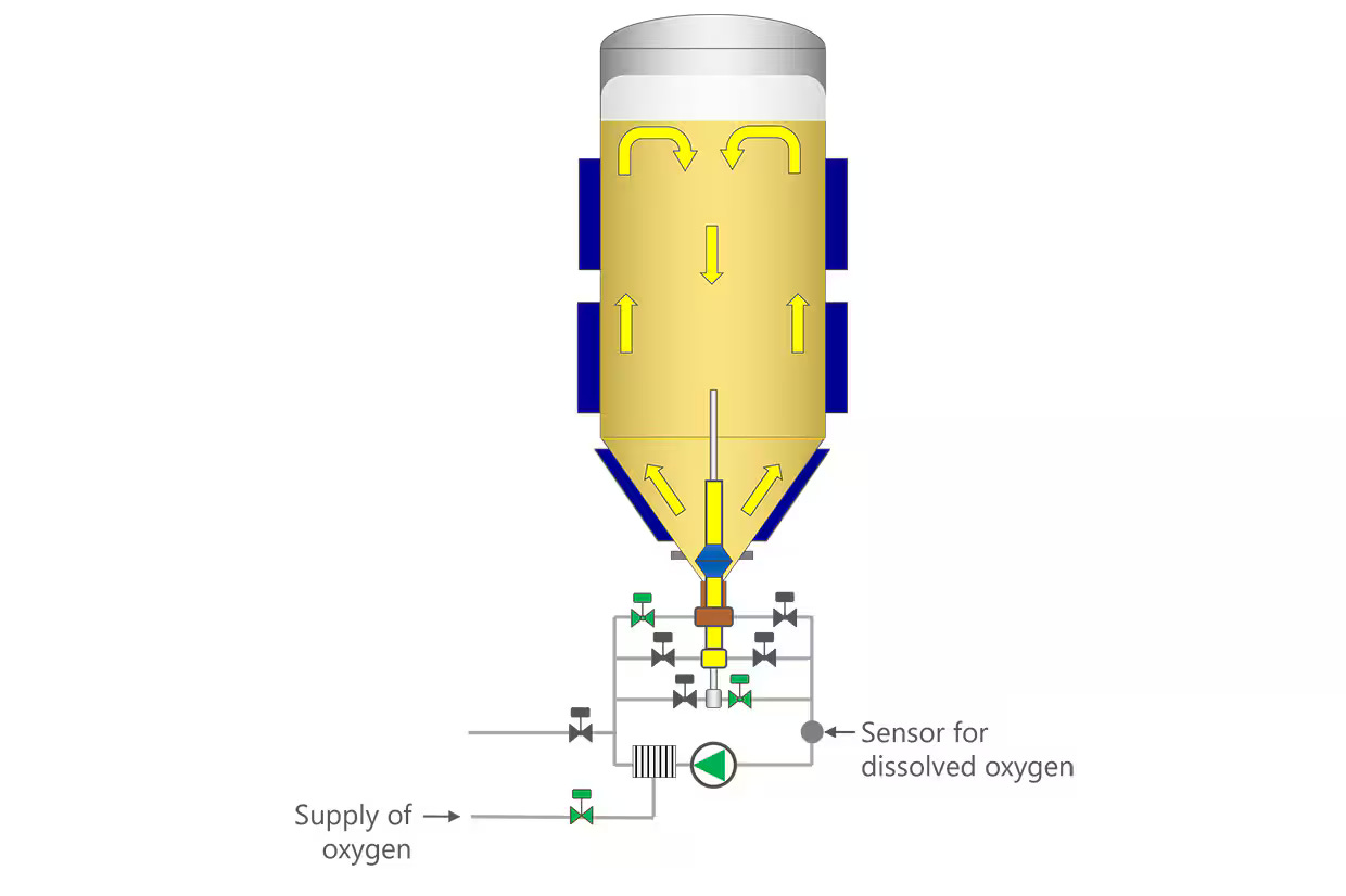 To use its Poseidon recirculation unit with crabtree-negative yeasts, Steinecker developed a variant featuring an integrated aeration system and oxygen sensor (see graphic). Here, too, recirculation keeps the yeast in a more homogeneous suspension in the beer, which in turn improves flavor development and speeds maturation. Even more important, though, is its use for aerating the tank: During the maturation process, Poseidon recirculates the wort continuously and maintains a consistent oxygen content of between 1.0 and 1.5 parts per million (ppm). To develop the desired aroma profile, a high temperature must be maintained for as long as possible – all the while in an aerobic environment. In trials conducted in the Steinecker Technology Center in collaboration with Novenesis, a producer of crabtree-negative NEER yeasts, these conditions could be maintained for well over 20 hours using Poseidon. In the end, these tests produced fully flavored beer containing 0 percent alcohol in just two days.