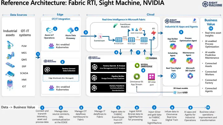 At Ronal, Sight Machine’s Furnace Agent suggests recommended values for casting and furnace process parameters in real time. These agentic recommendations are made available within the 3D visual environment enabled by NVIDIA Omniverse. As Ronal evolves its long-term IT and OT architecture, Sight Machine’s integration with Fabric RTI gives Ronal confidence that the entire technology, data platform, and AI agent stack scale seamlessly.