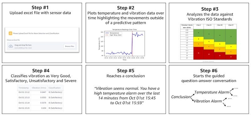 The architecture leverages Amazon Bedrock to deploy a multimodal generative AI assistant for root cause diagnosis within predictive maintenance frameworks. By integrating Retrieval-Augmented Generation with Amazon Bedrock Agents, the system fuses unstructured data like thermal imagery and technical manuals with structured time-series telemetry. This approach facilitates automated inference aligned with ISO 13374 standards for condition monitoring and diagnostics. Unlike traditional vibration analysis or standalone rule-based prognostic systems, this multimodal implementation enables the identification of latent failure modes through cross-referencing visual anomalies with semantic search results from vector databases. By automating the synthesis of disparate diagnostic inputs, the framework addresses the limitations of siloed monitoring tools and provides a scalable alternative to manual expert analysis in complex industrial environments.