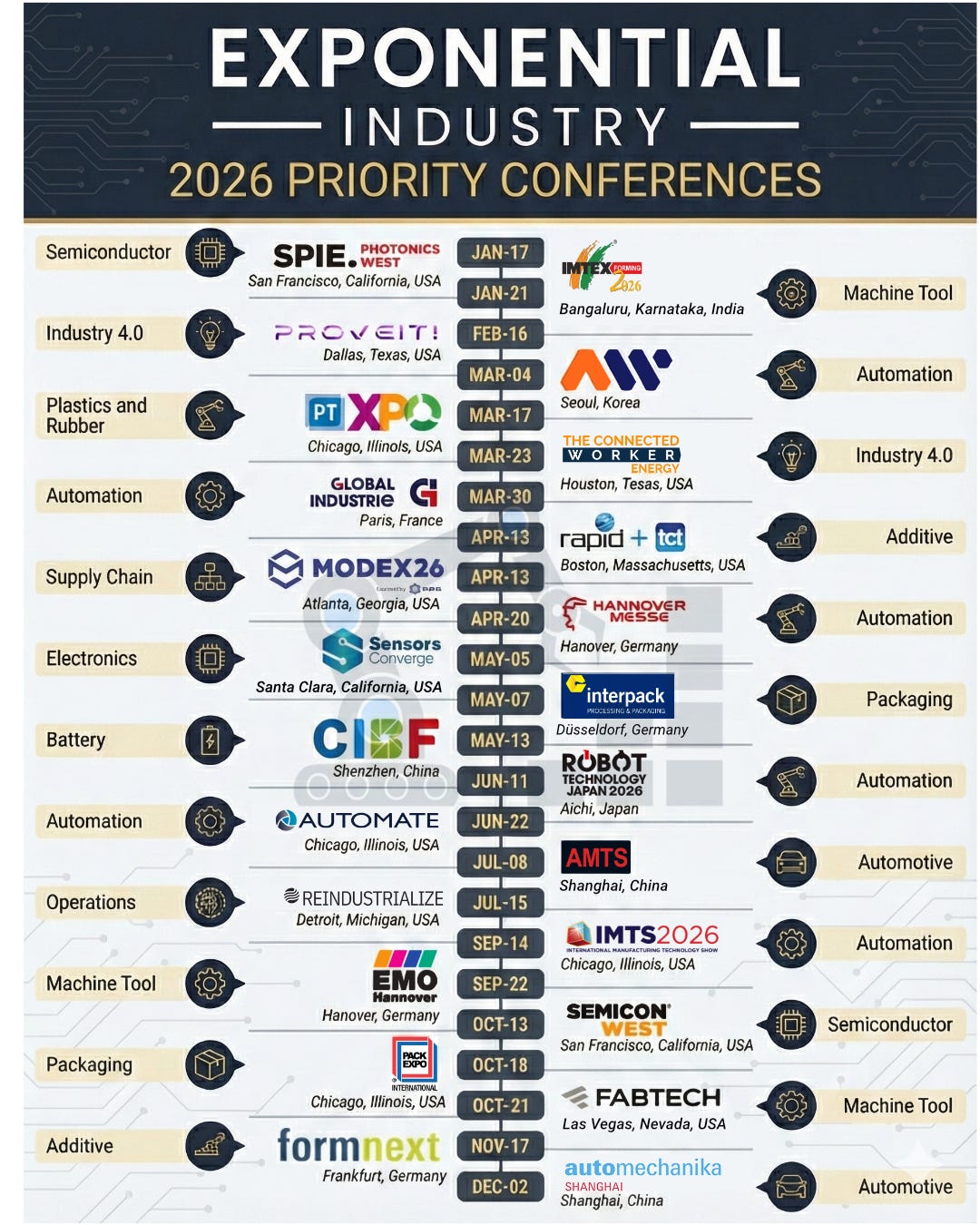 According to Elon, to unlock double-digit growth over the next year, we must accelerate applied intelligence. With 2026 on the horizon, I have curated a list of 24 essential events across the industrial tech landscape. The selection focuses heavily on next-gen manufacturing and high-tech components across AI Factories, Energy Systems, the Physical Capital Stack, and Embodied AI.