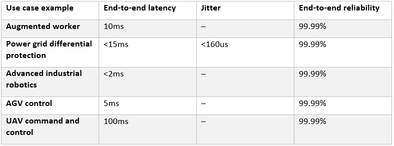 Automated guided vehicles (AGVs) and advanced industrial robotics have been broadly deployed in today’s flexible manufacturing systems, often requiring very low communication latency and high reliability, such as 5 milliseconds (ms) end-to-end latency and 99.99% reliability for the operation of AGVs. The “augmented worker” is emerging in modern industrial processes, which entails a remote task expert providing guidance and support for field workers through augmented reality (AR) devices. The use case usually requires 10ms end-to-end latency and 99.99% reliability. However, wireline solutions will not be applicable for these use cases because mobility is also a critical requirement of each scenario.